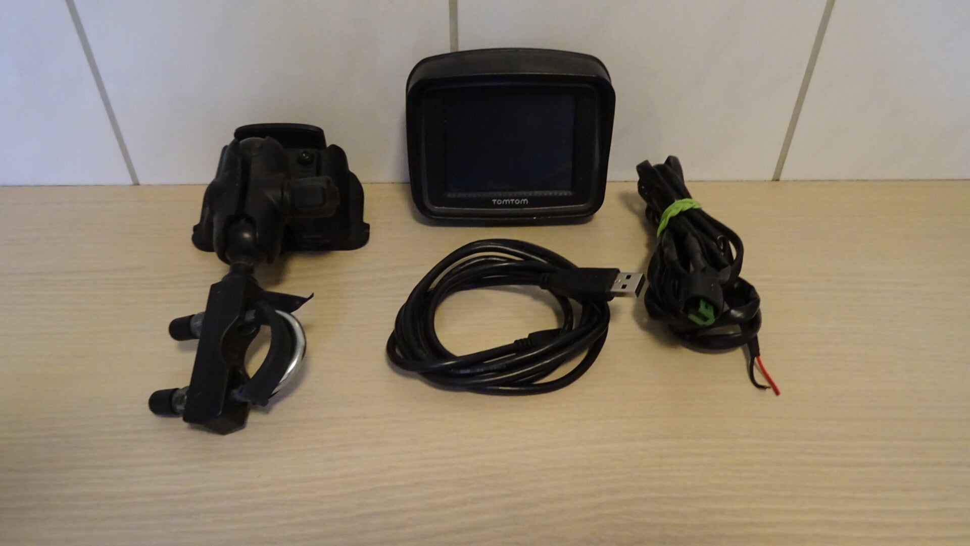 TomTom Rider met mount , Stuurhouder , USB kabel , en accukabel op de motor.